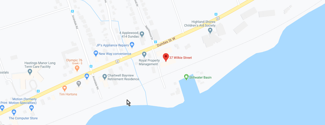 We are located in a residential neighbourhood on the corner of Dundas Street West and Wilkie Street. Situated near a Marina, some rooms enjoy a view of the bay.